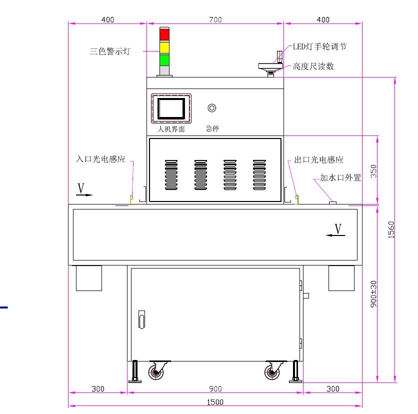 | 3、LED灯照射面尺寸:350*25mm*2组 | 4、人机界面触摸屏控制 |