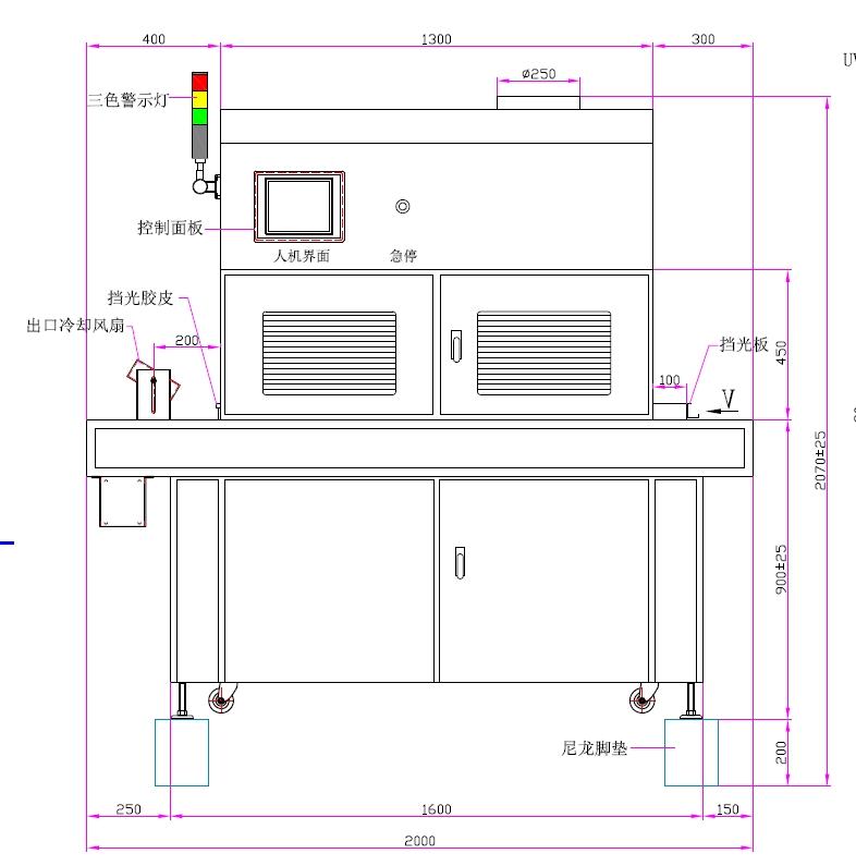 | 1、UV光源:LED2组、UV汞灯2组 | 2、UV汞灯总长:950mm、弧长850mm |