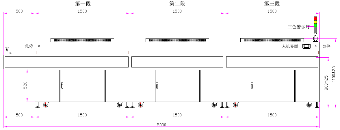 | 9、输送速度:0~5m/min(每段速度单独控制) | 10、入口高度:35mm |