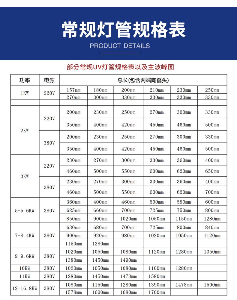 这款UV灯管专为各行业打造。主波峰310nm-410nm、功率400W-18kw、长度120mm-1179mm、管径Φ22.5mm-Φ25mm皆可定制。220V-380V供电,纯钨电极,800-1000h质保。能满足